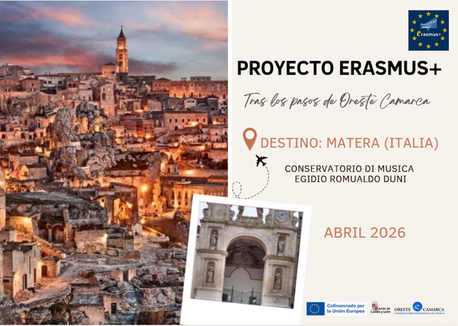 El Conservatorio Profesional de Música “Oreste Camarca” de Soria convoca movilidades en grupo de estudiantes para realizar formación en el Conservatorio di Musica Egidio Romualdo Duni Matera (Italia) de acuerdo con el programa Erasmus+ de movilidad concedido.